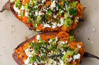 Twice Baked Miso Butter Sweet Potatoes with White Beans & Scallion Oil