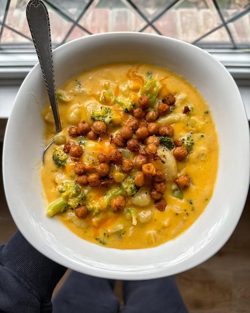 Broccoli Cheddar Gnocchi Soup with Crispy Spicy Chickpeas