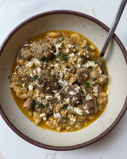 The meatballs are made with feta and za’atar and then simmered in broth with some pasta. The pasta soaks up some of the broth so it’s not as soupy, but it still has some liquid that you can scoop up with your spoon.