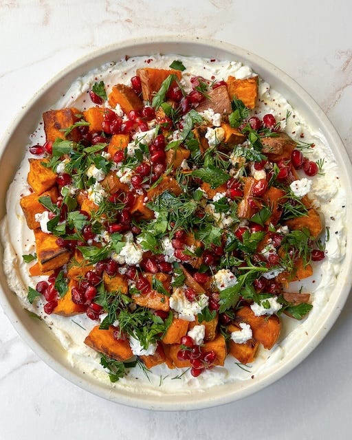 Chili-Roasted Sweet Potatoes over Garlic Labneh with Feta, Pomegranate Seeds, and Herbs