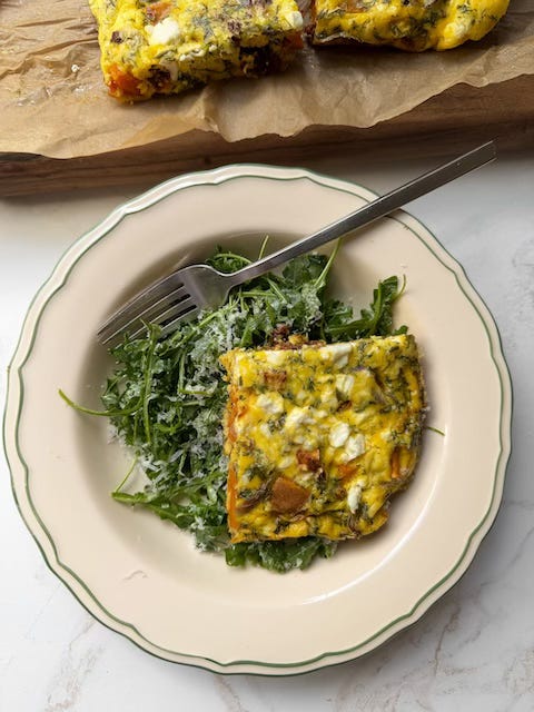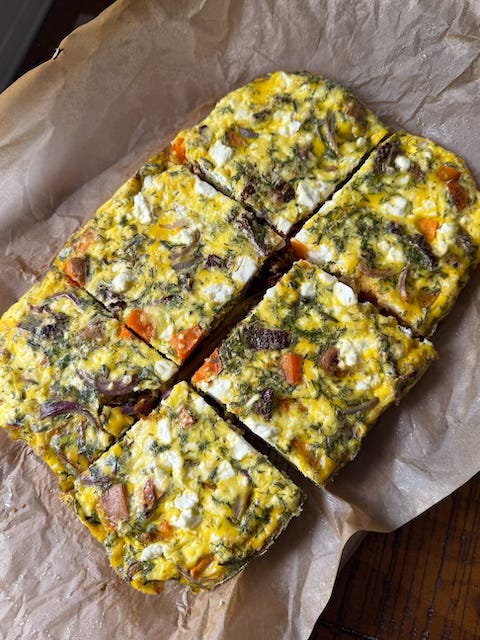 Today, we are starting with a frittata bake. This frittata is made with sweet potato, red onion, sun-dried tomatoes, rosemary, and dill, and it’s topped off with some feta for a tangy, salty finish.