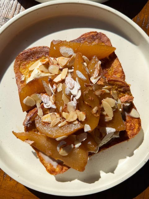 Then you poach some pears with water, chai tea bags, and maple syrup until they’re nice and soft and infused. Once those are done, you add some brown sugar to the pot to make a light syrup that you can drizzle over the French toast.
