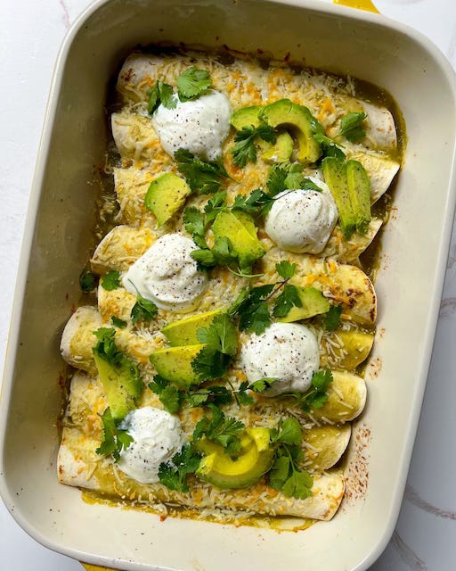 These are vegetarian enchiladas made with refried beans, cheese, and green chiles. I’m a huge fan of the Siete refried beans if you’re looking for a recommendation — I believe they have a green enchilada sauce as well.