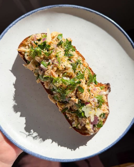 I made kimchi toast the same morning that I made this tuna salad, so I really wasn't in the mood for toast again. I served Grant’s tuna salad over bread, and I ate mine in a bowl with some almond flour crackers. I actually really liked the concept of a tuna salad as a dip, so I can recommend it either way.
