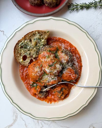 I’m giving you three recipes to make with these meatballs. The first is a pearl couscous and hot honey halloumi salad topped with meatballs. The second is meatballs with vodka sauce with buttered garlic parsley bread. The third is a pesto soup.