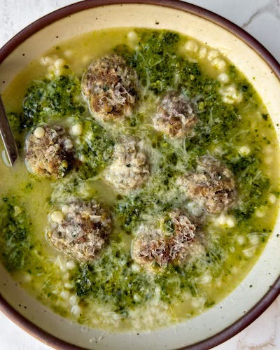 I kept this soup really simple — you just combine meatballs with broth and pearl couscous and then mix in pesto and top with Parmesan. You could beef the recipe up (no pun intended!!!!) with some sautéed veggies too! My favorite pesto is from Gotham Greens — I get it at Whole Foods.