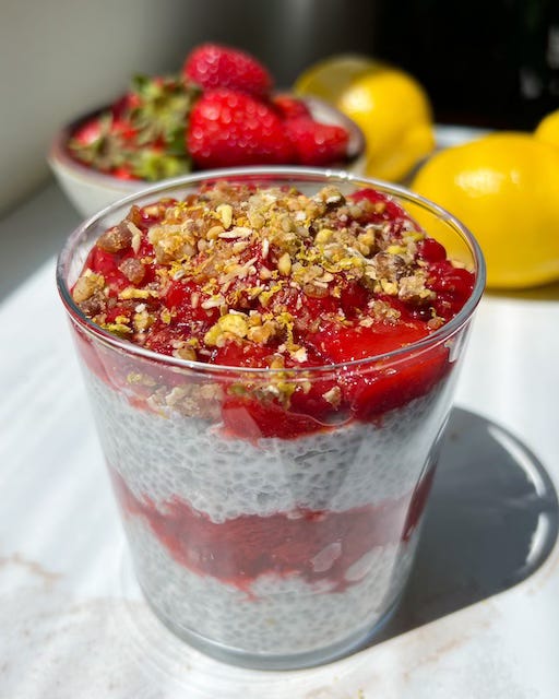 I actually think this might be my most favorite chia seed pudding I’ve ever made. It’s like a lemony custard combined with a strawberry pie. The base of the chia seed pudding is half Greek yogurt half plant milk — I like to use the Greek yogurt for some extra protein and a little tang — and it’s mixed with coconut and lemon for extra flavor. I leave it unsweetened because the toppings are sweetened enough.