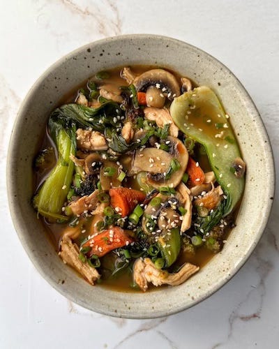 1. Heat up oil in a medium pot on medium-low heat. Add the ginger and garlic, and cook for 1-2 minutes until fragrant. Add the mushrooms, baby bok choy, shredded chicken, cooked broccoli and carrots, chicken broth, and soy sauce. Bring to a low simmer, and cook for 5-10 minutes until mushrooms and bok choy have softened.