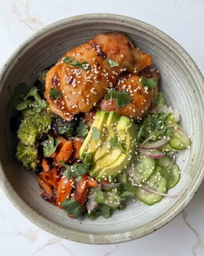 3. Divide the rice into two bowls, and top with chicken, cucumber mixture (including most of the rice vinegar), half of your roasted carrots and broccoli, and avocado. Spoon some marinade over the chicken, and serve topped with fresh cilantro and sesame seeds. Use more of the marinade as sauce, if desired!