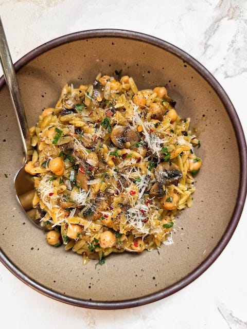 I had the realization this week that I haven’t been cooking with mushrooms enough, lately. I asked Grant what he was craving this week and he said orzo, and I thought, perfect — mushrooms pair perfectly with pasta. I love a one-pot orzo because it gives off risotto energy.