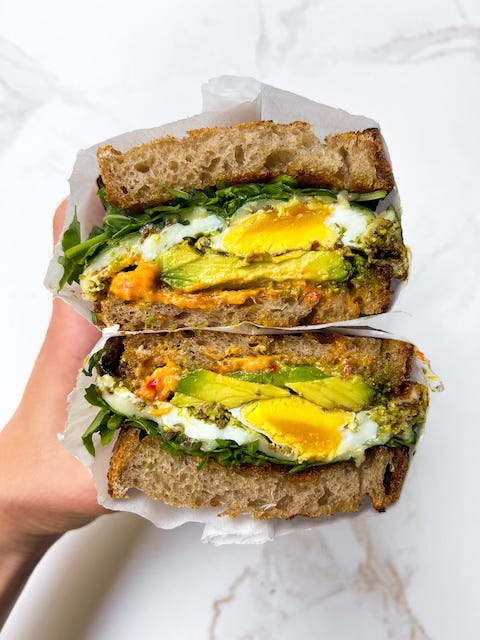 The premise here is simple, even though the sandwich feels like a little fancy treat. You fry the eggs in pesto, add a little melty mozzarella, and make a simple mixture of Calabrian chiles and garlic spread to create a special sauce. I used the Trader Joe’s garlic spread dip here, which is essentially toum, so you can use either. Or just use mayo if you can’t find either!