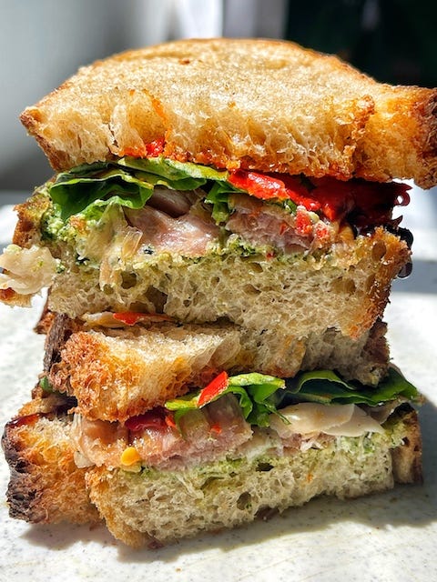 Prosciutto, Pesto & Goat Cheese Sandwich with Arugula and Calabrian Chilis