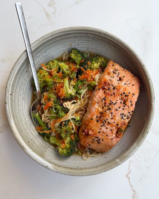 Brothy rice has been trending on social media which inspired me to make brothy noodles. Even though this is my regular newsletter and not my 30-minute meal series, this is a super quick dinner that’s made in 30 minutes or less! You just bake the salmon in a simple honey soy garlic sauce, and then you cook the noodles and vegetables in bone broth for extra protein and nourishment.