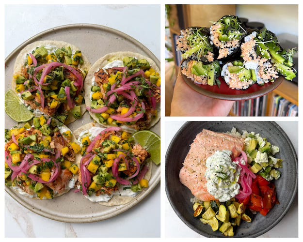 I included reheat instructions for the tacos, since it’s part of the recipe to fry them up with some taco seasoning. The salmon hand rolls don’t need reheating (yay), and if you choose to make the salmon bowl later, it can also be enjoyed cold, almost like a salad.