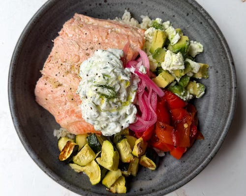 5. Top each bowl with the salmon, avocado feta salad, red peppers, zucchini, some pickled onions, and a big dollop of tzatziki.