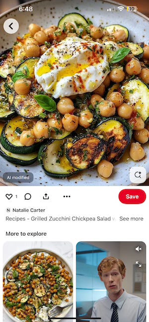 You can see here in the one and only screenshot I took that there’s a telling quality to the AI photos — it’s a bit uncanny valley. Thankfully, on some of them, Pinterest notes the image as “AI modified.” You can also see on this one that they took the concept of my Grilled Zucchini Chickpea Salad and just slightly modified it so it’s considered different (yogurt or burrata or whatever that is on top of the salad versus under it). My original recipe is suggested below it on the bottom left.