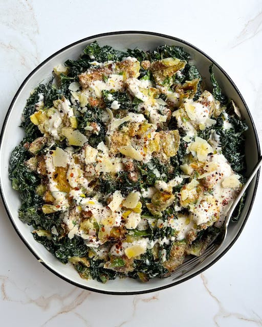 Smashed Potato Salad with Kale & Greek Yogurt Caesar