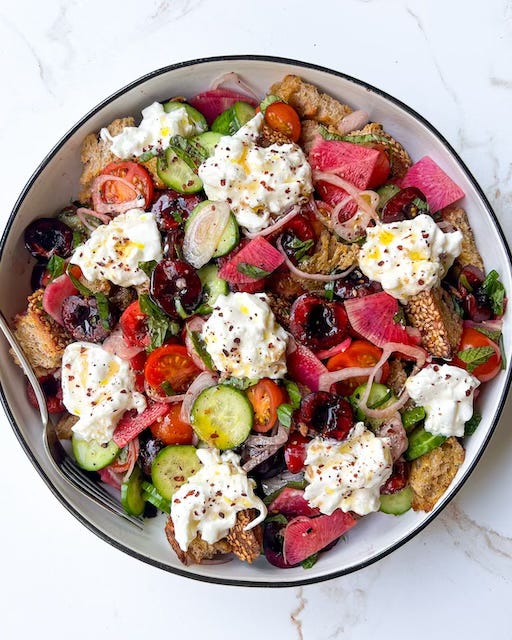The second I saw cherries in the store I knew I had to snag some, and I made a spring/summer hybrid panzanella that has tomatoes, cucumbers, watermelon radishes, shallots, basil, mint, and burrata. I used torn sourdough as my bread and tossed it in some garlic and sumac for extra flavor. And the dressing is a simple vinaigrette made with champagne vinegar, olive oil, mustard, and hot honey.