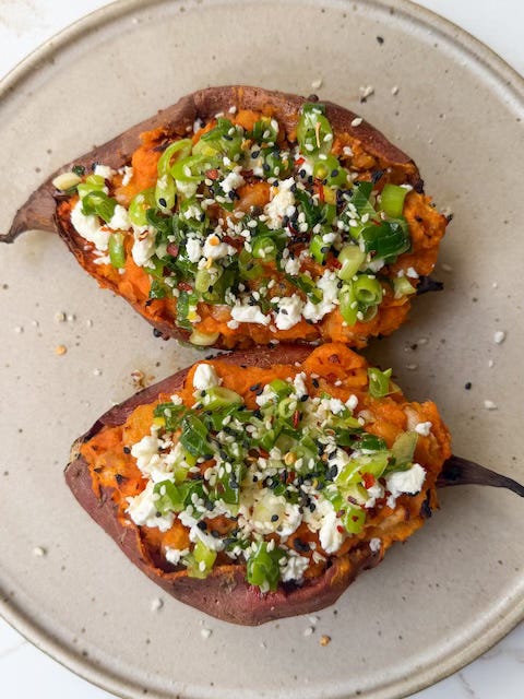 Last year, when I was in the height of my food aversions during pregnancy, I couldn't get enough of Justine’s Twice Baked Japanese Sweet Potatoes. She stuffed hers with miso, Skyr, and maple syrup, and it was just so soothing to me every time I ate it.