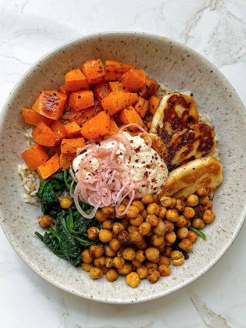 A few month ago I made a summer hot honey halloumi bowl, and now we have a winter hot honey halloumi bowl! The base of this one is also brown rice, but I used chickpeas for protein and loaded it up with sautéed spinach, roasted butternut squash, pan fried hot honey halloumi, quick pickled sumac shallots, and a yogurt-based mustard pear sauce!